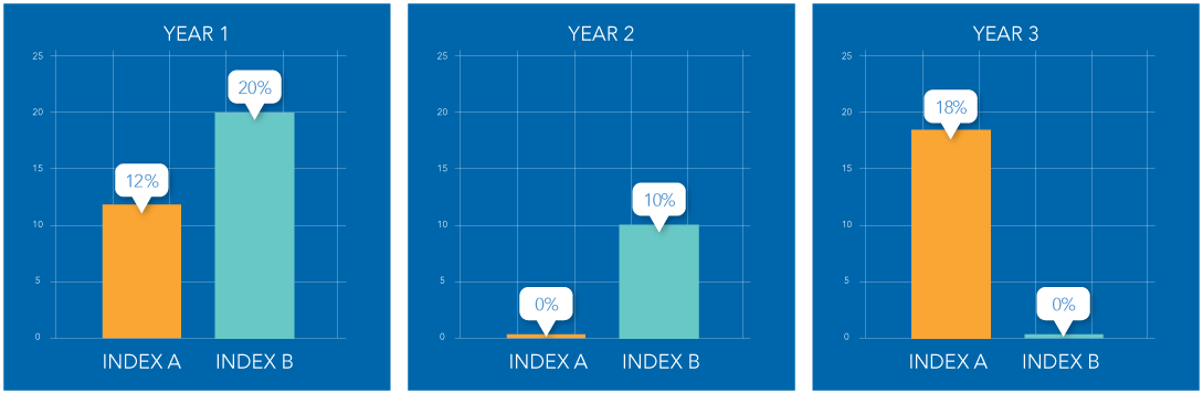Spreading allocations across multiple custom index options may provide smoother, risk-managed returns, especially if the indices are not correlated — in other words, the less their fluctuations match, the better.