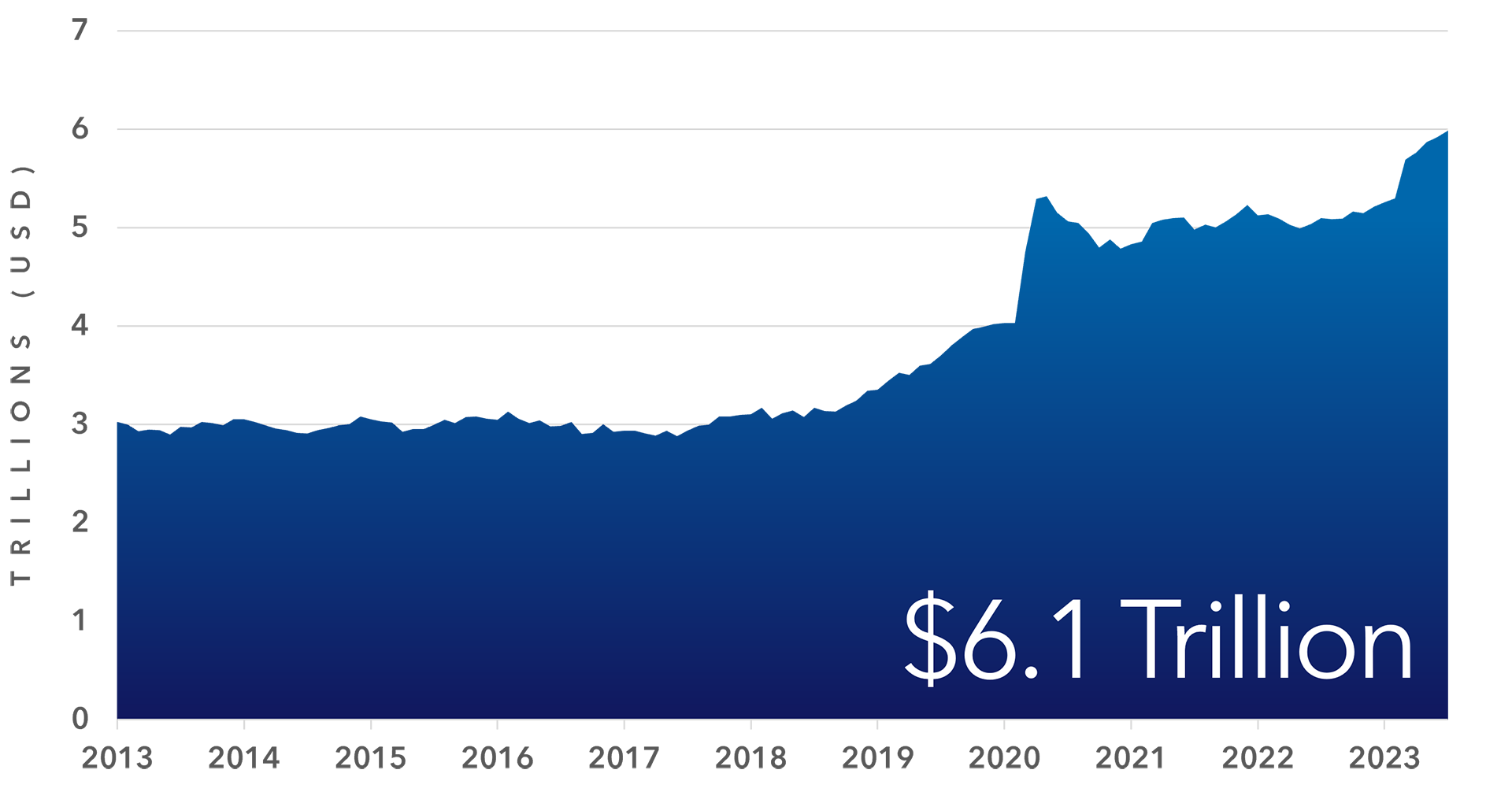 Source: Board of Governors of the Federal Reserve System (US), Money Market Funds; Total Financial Assets, Level [MMMFFAQ027S], retrieved from FRED, Federal Reserve Bank of St. Louis; https://fred.stlouisfed.org/series/MMMFFAQ027S, January 16, 2024.