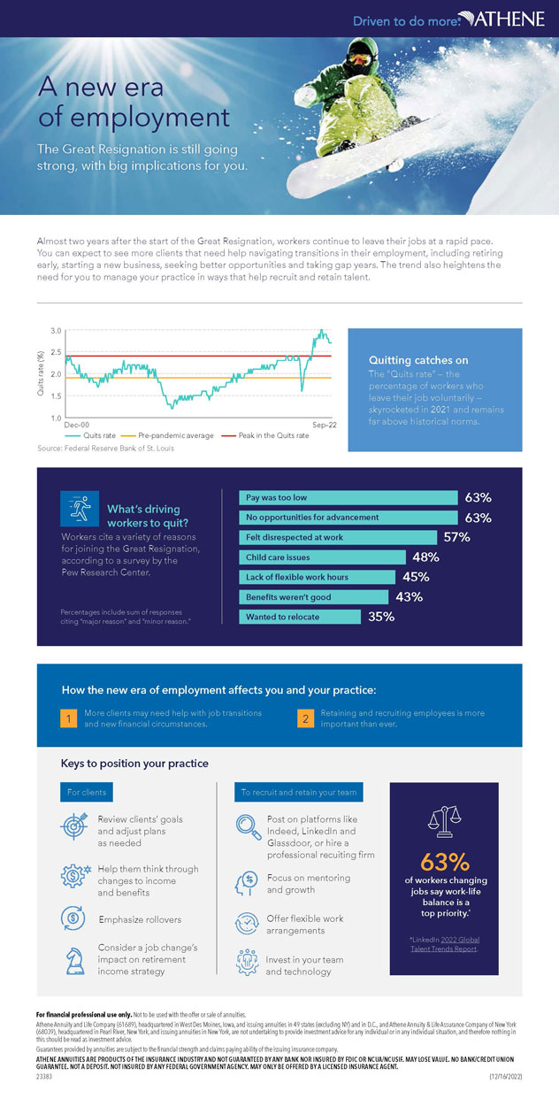 It’s important to share key strategies with your clients as they make career changes. For example, if a client changes jobs in search of more flexible hours, it’s an opportunity to discuss how the change may affect their ability to save for and spend in retirement, as well as how to prepare for the future. It’s important to let clients know that what may seem like a short-term move may have long-range impacts worth planning for.