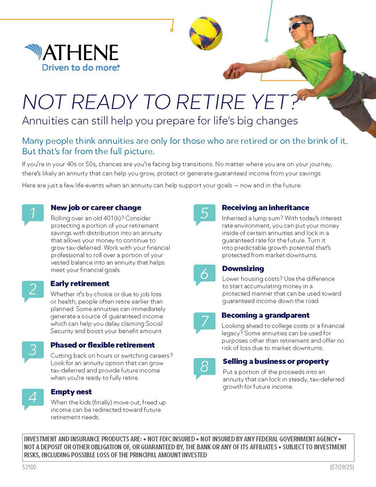 Your 40s and 50s are a critical time to get strategic about your financial future. Meeting with a financial professional can help you explore your short and long-term goals and determine which solutions may be a good fit. This may include taking a closer look at annuities and how adding more guaranteed income to your overall plan can help boost financial stability, reduce the impact of retirement risks and allow you to navigate life’s changing needs with greater confidence.